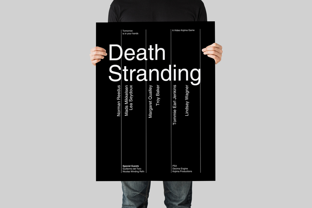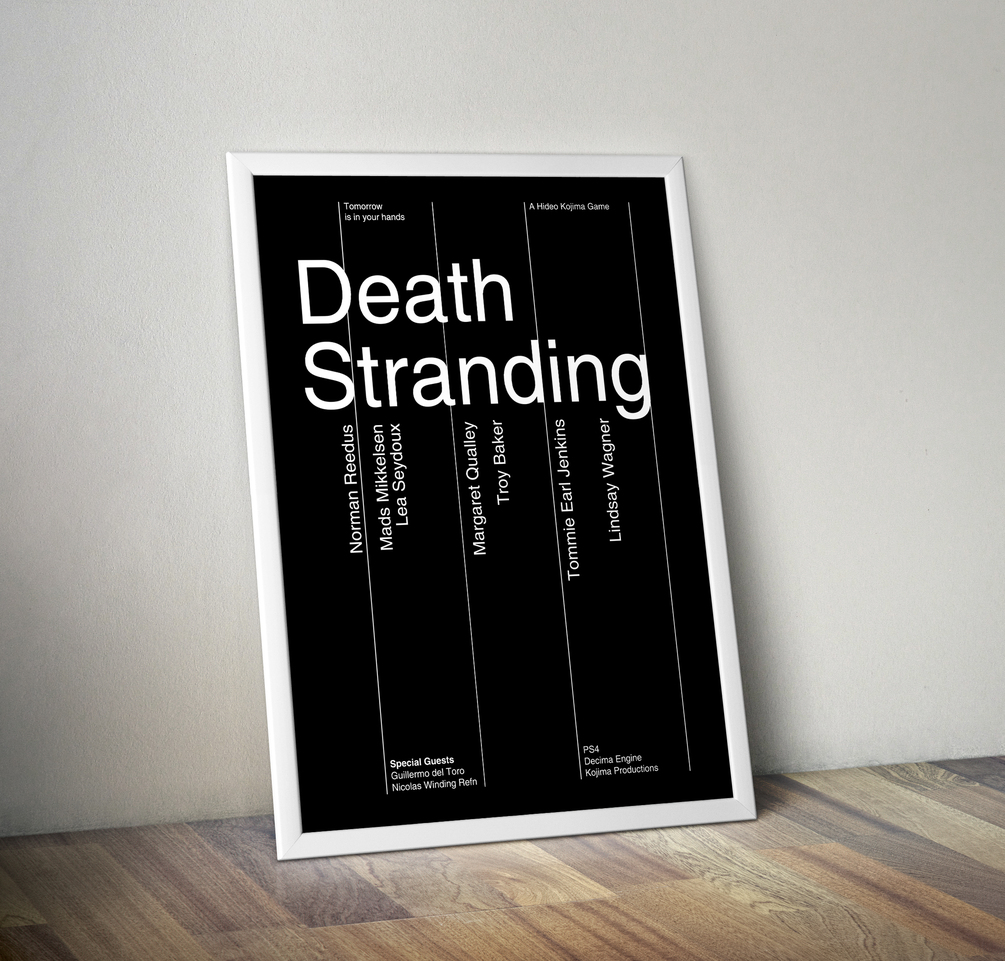 Our homage to Death Stranding, the new PlayStation game by Hideo Kojima, in a typographic poster format with Swiss style.